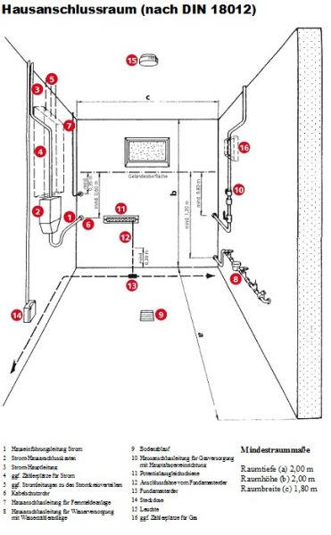 Er darf außerdem nicht gleichzeitig Aufstellungsraum von Feuerstätten oder Lagerraum von Brennstoffen etc. sein. Die Hauseinführung sollte in - oder in Nähe - der straßenwärts gelegenen Hauswand vorgesehen werden.)